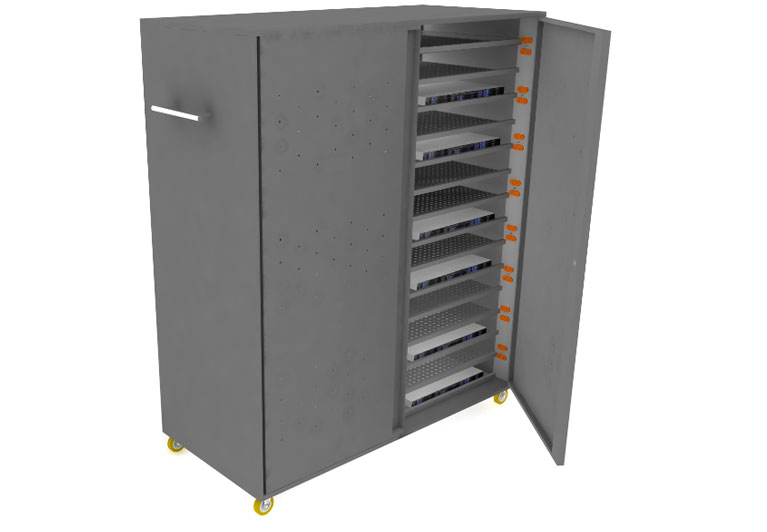 Armario de seguridad con doble puerta y chapa con llave para la carga o transporte de computadores portatiles en una misma estructura, su diseño con dos cuerpos permitira al usuario poder almacenar de forma organizada cada una de sus laptops en su interior.