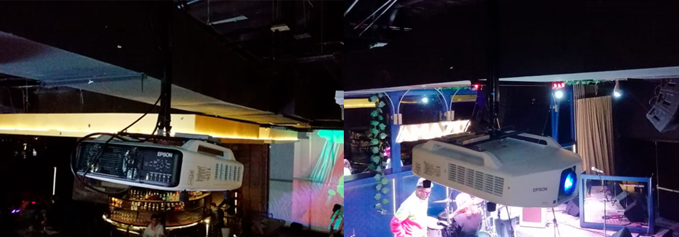 Como podemos ver en las anteriores imagenes, realizamos la instalacion de un proyector marca epson Z10000 el cual cuenta con unas medidas aproximadas de 73 Cms (Profundidad) x 53 Cms (Ancho) x 16 Cms (Altura) , por lo cual debimos realizar una fabricacion de soporte especial para videobeam teniendo en cuenta los orificios que este videoproyector trae para su instalacion, asi mismo usar los tornillos adecuados para el correcto montaje del videobeam en el soporte y este anclarlo en el techo de forma segura.