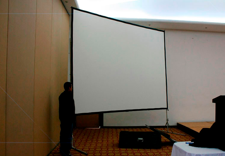 Telon de proyeccion con base y estructura de piso, su diseño cuenta con una estructura en
