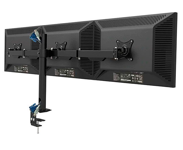 Una de las otras posiciones en la cual puedes instalar tus 3 pantallas de monitor en el excritorio es realizar el montaje uno sobre otro, ideal para monitoreo de camaras o demas de forma vertical en una posicion ergonomica en todo momento.
